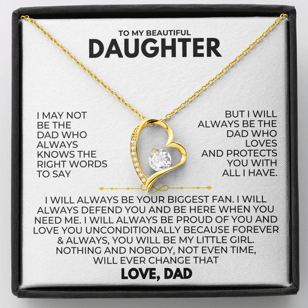 "TO MY BEAUTIFUL DAUGHTER - I may not be the dad who always knows the right words to say, but I will always be the dad who loves and protects you with all I have. I will always be your biggest fan. I will always defend you and be here when you need me. I will always be proud of you and love you unconditionally because forever & always, You will be my little girl. Nothing and nobody, not even time, will ever change that. LOVE, DAD"